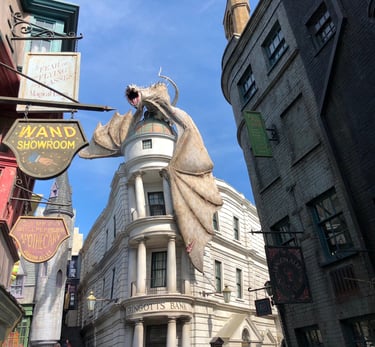 After eating a delicious lunch at the Leaky Cauldron and trying out a few spells throughout the alley, I was ready to do some exploring. On top of Gringotts bank, a dragon (specifically a Ukranian Ironbelly) is perched on top of the bank. This is a reference to the Deathly Hallows Part Two. This dragon will randomly start breathing real fire and you can feel the heat from the crowd. The dragon breathes flames up to 3,560 degrees Fahrenheit. Inside of Gringott’s bank you can exchange real money for wizarding money. This is a really fun experience because you can interact with the animatronic goblin and you can keep the wizarding money as a souvenir or spend it throughout Diagon Alley.