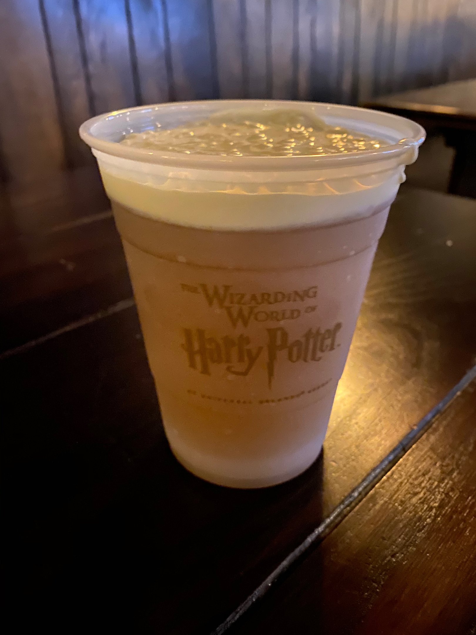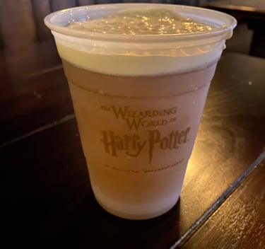 As you wander through the jagged brick archway into Diagon Alley, you are completely emerged into a different world. This area of the theme park feels as if you have stumbled onto a movie set. The attention to detail is amazing. In order to truly understand the level and depth of detail that surrounds you have to be familiar with the Harry Potter books or movies.I decide to have an early lunch and dine at the Leaky Cauldron. Outside the restaurant above me hangs a metal sign of a witch stooped over a cauldron. The sign has a few drops of water on it and at my feet is a puddle of water. This is just one of the tiny often overlooked details form the Wizarding World. Once inside the restaurant you can gaze around the massive cauldron at the front of the room. I had the fish and chips which were fresh and crisp. I sipped on some delicious butter beer throughout my lunch. I have tried all three types of butterbeer: hot, frozen, and original. My favorite type is the original.