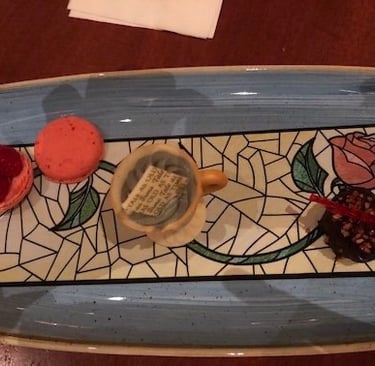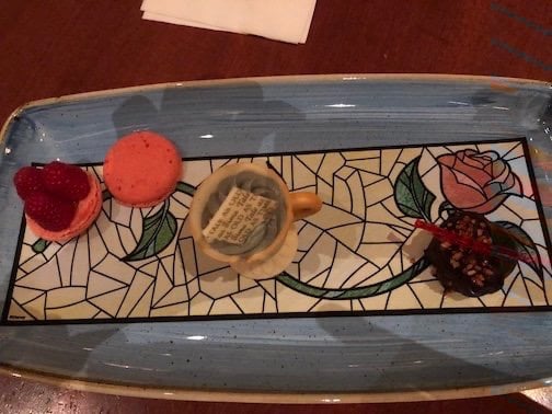 For dessert, you receive three different items: An almond macaroon, a white chocolate “Chip” cup, and a dark chocolate raspberry truffle. Yes, the “Gray Stuff” is delicious! Even the decorative paper on the plate is edible. All of the desserts were excellent!. After you have finished your dinner, you have a special chance to get your picture taken with the Beast. Why is this so special? Be Our Guest is the only place where the Beast makes an appearance. This is exclusive to those who have a dinner reservation.