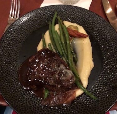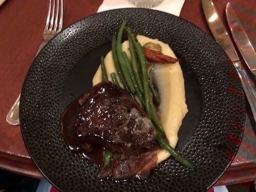 You have a choice of appetizer, entrée, and of course, dessert. They also have signature non-alcoholic drinks, as well as different options for wine. For my appetizer, I choose the Mixed Field Greens salad. This consisted of heirloom tomatoes, house farm cheese, and a citrus vinaigrette. My entrée was the Center-Cut Filet Mignon. On the side were Yukon potatoes, seasonal vegetables, and a Cipollini marmalade with a red wine sauce. The steak was both delicious and tender.