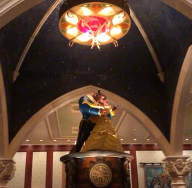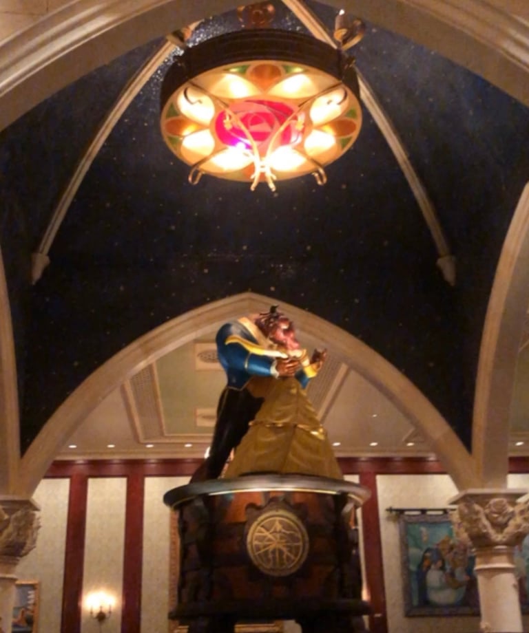 Be Our Guest restaurant in Disney’s Magic Kingdom, is inside the Beast’s castle. There is a small bridge you cross before entering double doors. In the corner there is a stained-glass window. This is a great picture spot. Each room is impressive with high ceilings, detailed art work, and beautiful décor. Throughout the castle, you will find pictures of Belle and the Beast. For dinner, there is a three-course prefixed menu.