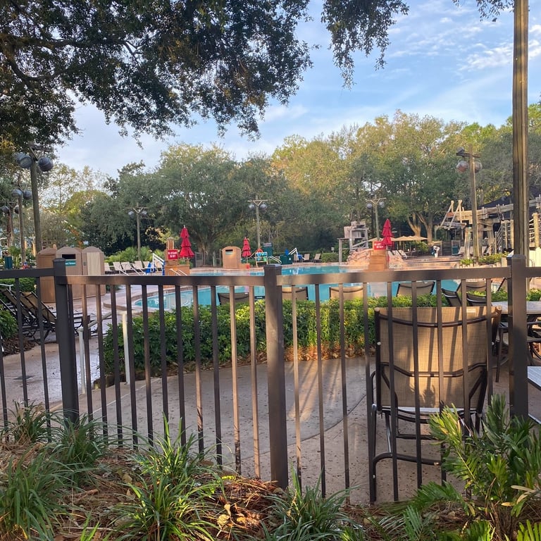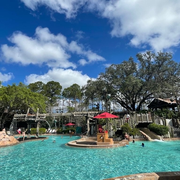 The resort is home to a sit-down dining location, Boatwright’s Dining Hall, and one of my favorite quick service dining options, Riverside Mill Food Court. The resort also has an amazing gift shop near the lobby, Fulton’s General Store, with adorable animatronics in it! Fulton’s General Store will have your iconic Disney merchandise, some of which you can find in the parks, as well as souvenirs related to New Orleans and Tiana. This gift shop is quite large and decorated with perfect Disney theming. It’s worth a walkthrough even if you aren’t planning on buying anything. There are a few special things that make this resort particularly unique. The first is that this resort has its own water taxi to Disney Springs. The ride takes no more than 15-20 minutes. Additionally, it is connected by a walking trail to Disney’s French Quarter Resort. Riverside also has its own horse drawn carriage rides. For an added cost, you’ll be able to take a 25-minute ride around the resort’s Sassagoula riverbank. One of my favorite parts of the resort is the main pool located in the center of the resort in Ol’ Man Island. While there are also smaller pools scattered throughout the resort, this is the only place you'll find a waterslide! Near the pool there are lots of shaded areas and plenty of chairs.